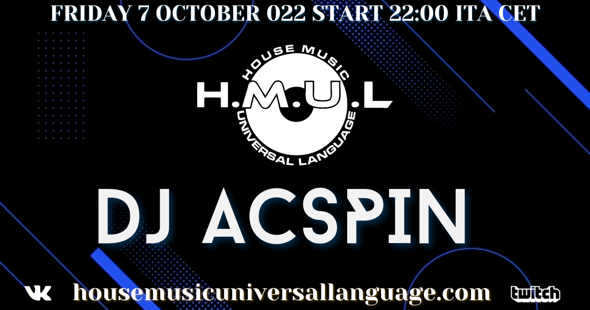House Music Universal Language è lieta di presentarvi Dj Acspin artista canadese. La diretta verrà trasmessa: Sul sito https://housemusicuniversallanguage.com Su Twitch https://www.twitch.tv/hmul …