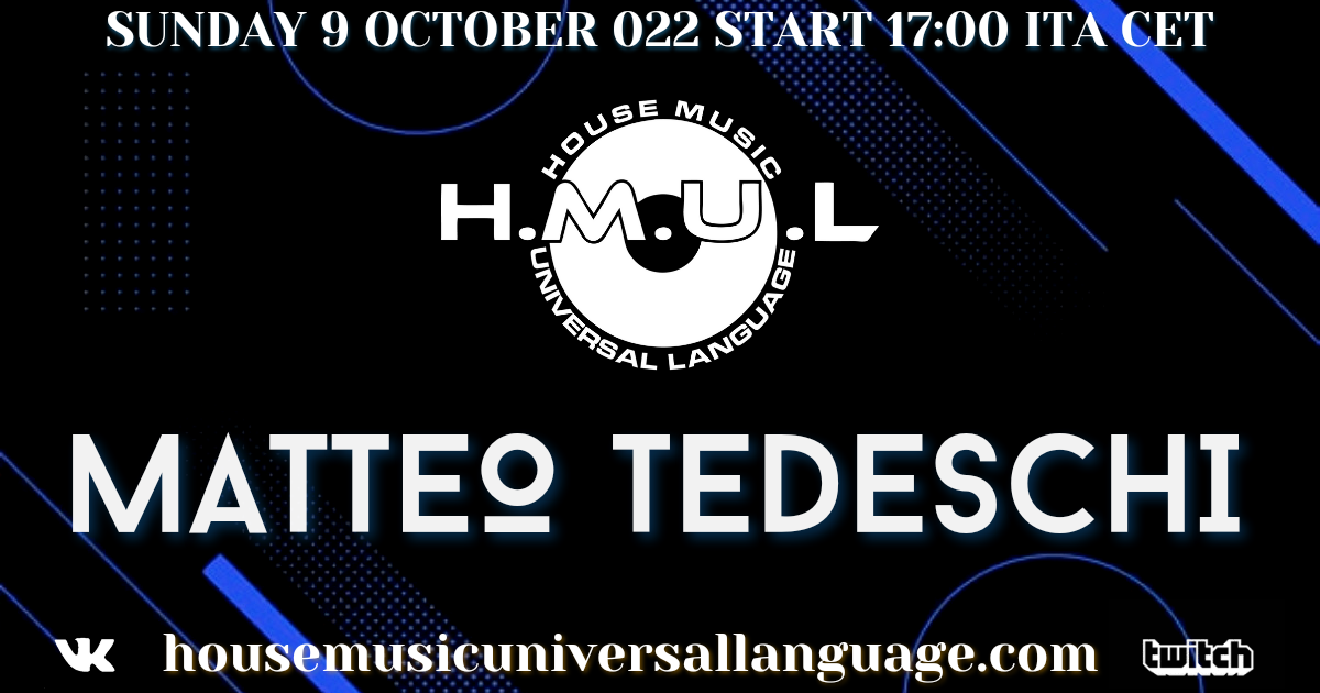 House Music Universal Language presenta Matteo Tedeschi artista italiano. La diretta verrà trasmessa: sul sito https://housemusicuniversallanguage.com su https://www.twitch.tv/hmul su https://vk.com/public181143249 House Music Universal …